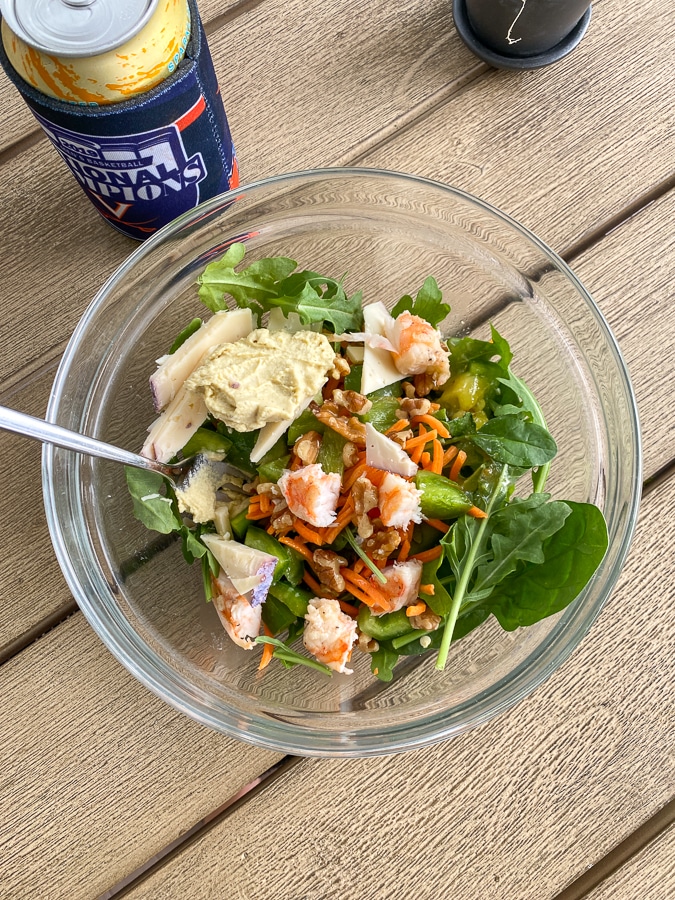 With leftover shrimp, drunken goat cheese, carrots, walnuts, peppers, and homemade dressing from my e-book!