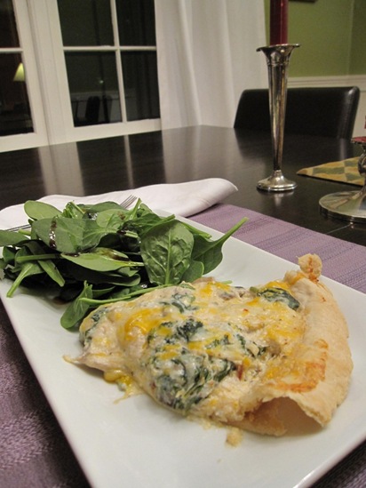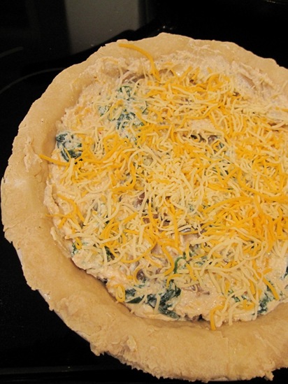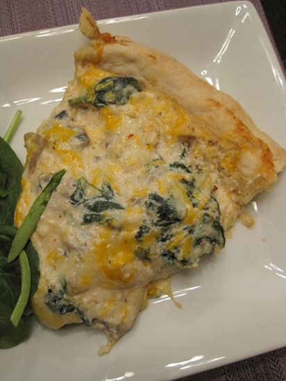 Here’s the proportion of ingredients we used. See the above link for the specific procedure. We cut down on the butter, and added the mushrooms, spinach and lots of cheese. The cheesy taste was perfect, but it was a nutritional overload combined with the buttery crust. It was really more like a pie than a quiche!