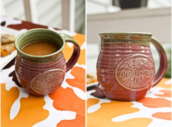 Mug shot!! We had some mugs custom made by local potter John of Acorn Pottery. They are so pretty with their two tones! I smuggled one home from the bakery 🙂