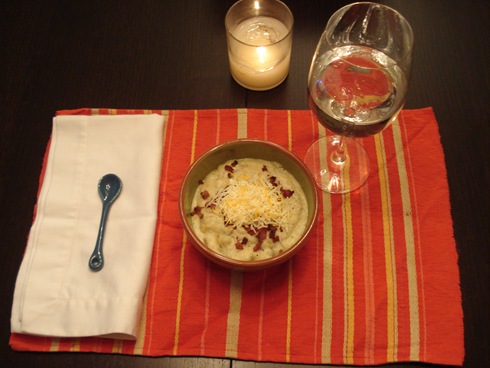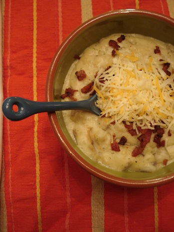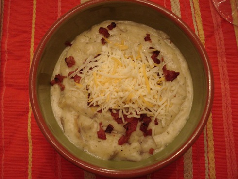 Check on consistency, and mash potatoes more if desired. If you want a completely liquidy-thick soup, you could use a stick-blender to puree. Otherwise, portion into bowls, and garnish with bacon and cheese! Crusty rolls on the side would be a nice touch…