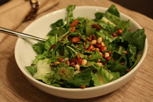 I also made a side salad with arugula and romaine tossed in some Annie’s Gingerly dressing and BethT‘s spiced nuts!