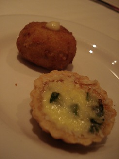 We started with passed hors d’oeuvres – mushroom, eggplant and white bean crostinis and crab cakes with asparagus parmesan tartlets –