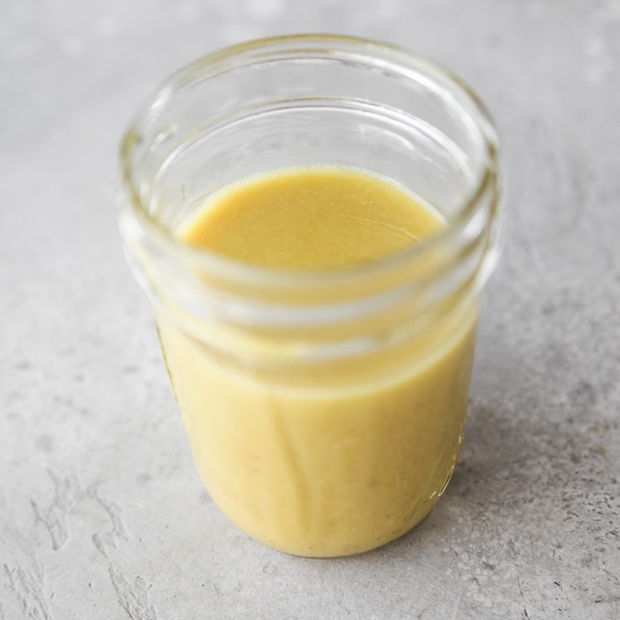 The dressing is a simple white balsamic. I love white balsamic compared to dark for its milder taste. You can put this dressing on pretty much anything since the flavors are neutral! Add some fresh garlic if you are a garlic lover.