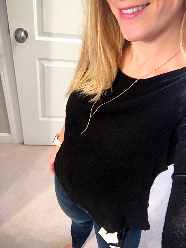 This black top is an old Stitch Fix purchase. I love the little sheer criss-cross ruffle on the bottom. My necklace is Stella and Dot, the New Moon Necklace.