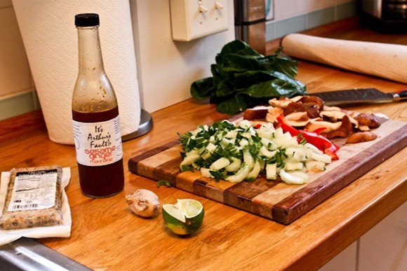We sautéed bok choy, pepper, shitake mushrooms, ginger and half a slab of tempeh in our wok and added the sauce for flavor.