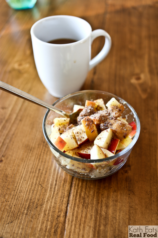 Breakfast Monday morning was centered around all that was left of our fruit bowl: one big apple. I chopped it up and microwaved it over a little leftover oatmeal plus some ground flax and a big spoonful of peanut butter.