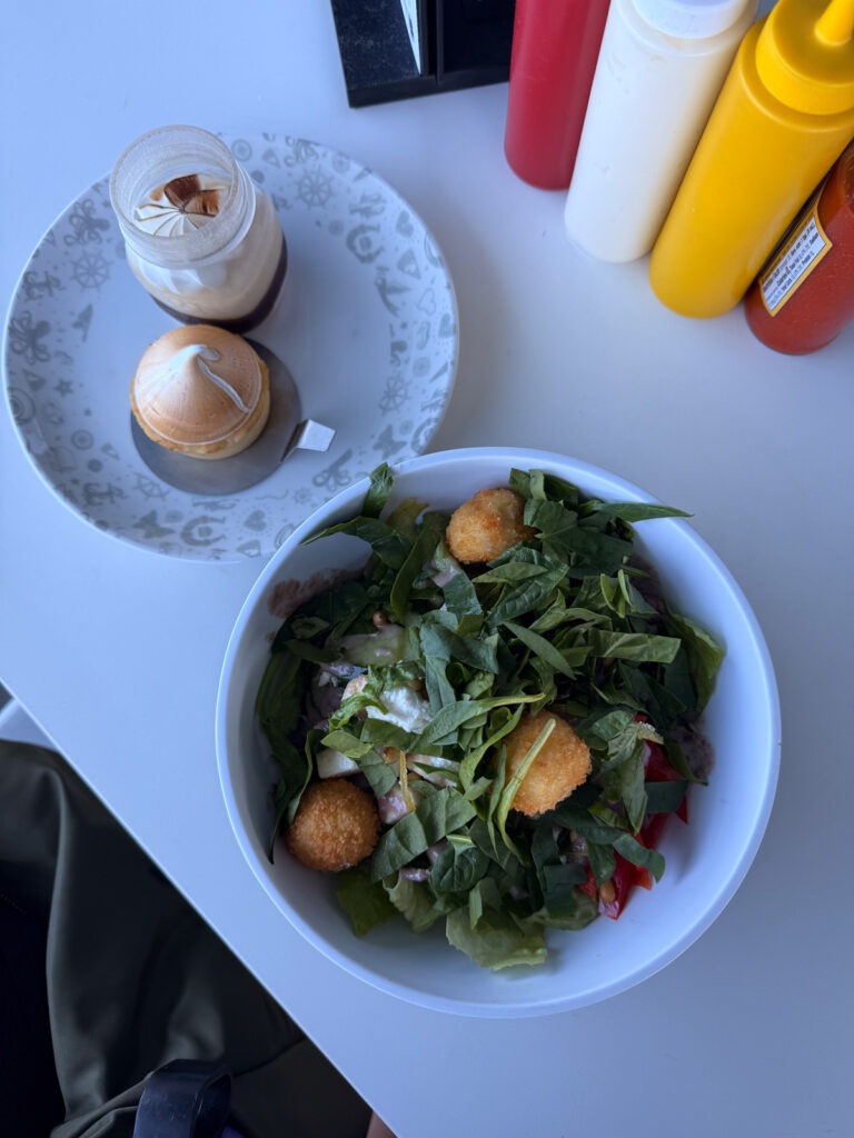 This is the perfect lunch – healthy salad bowl with fried cheese and tons of greens and veggies and then the two best desserts: S’mores in a jar and the Passionfruit Tart with meringue topping. What I would do to have this meal again!!