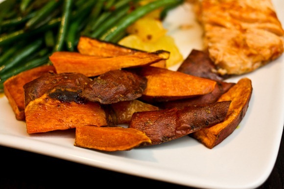 That’s my all-time favorite dinner- salmon, greens and sweet potato wedges!