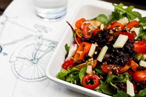 I pulled together a salad – greens, peppers, cuc, tomatoes, beans topped with coconut oil (yum!), honey, salt, manchego cheese and pecans