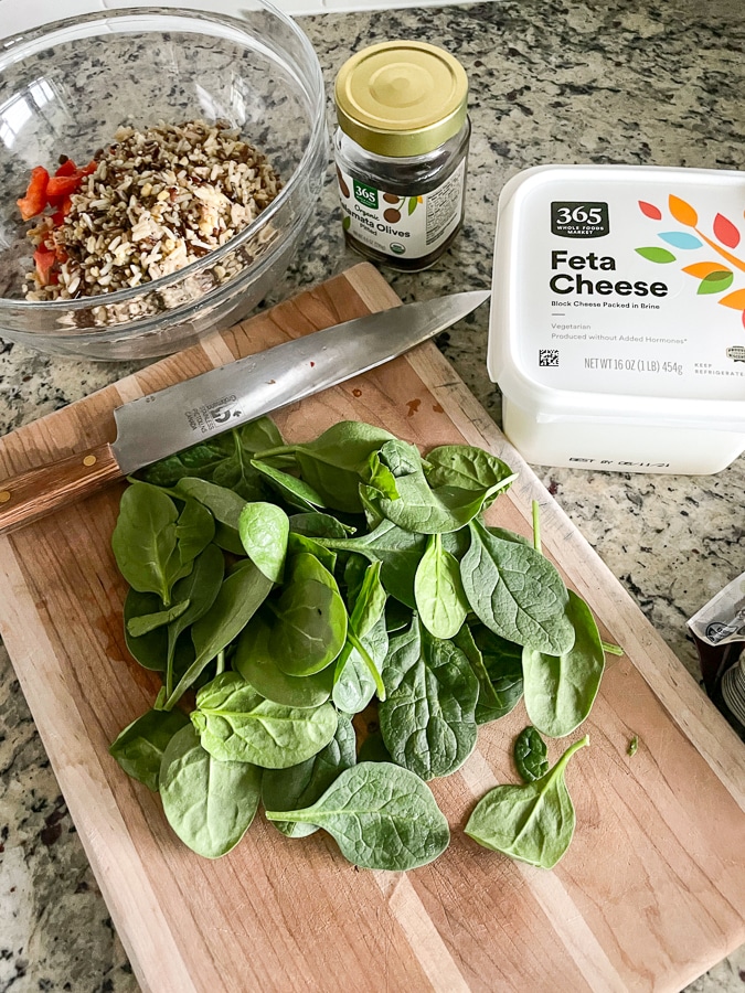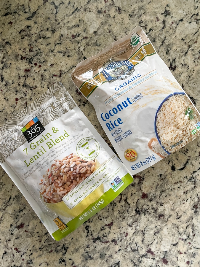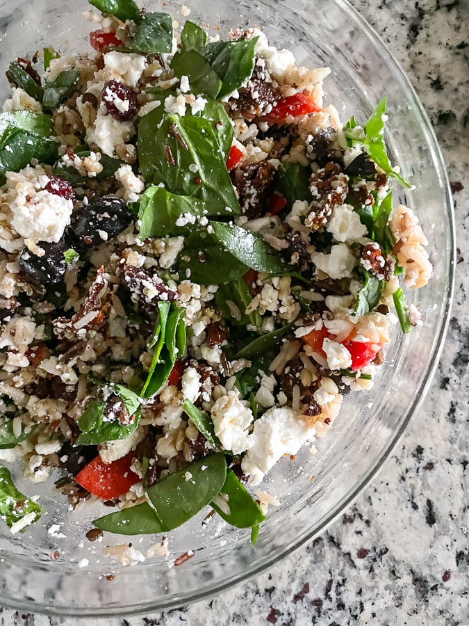 These rice and grain packs from Whole Foods were perfect as the base! (I haven’t tried the coconut rice yet!) I added feta, olives, sun-dried tomatoes, bell peppers, chopped spinach, walnuts, cranberries, and olive oil and lemon. So good!