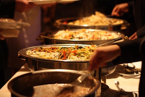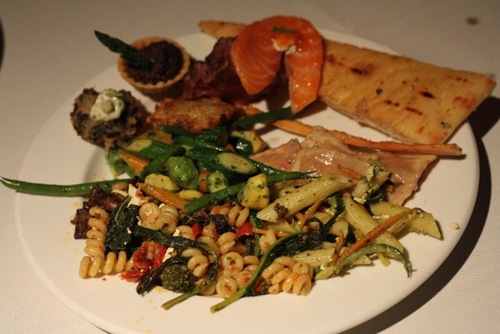 After the toasts, dinner was served. They had 3 buffet stations of amazing foods. The first was four different pastas, the second bite-sized gourmet treats and the third vegetables, salmon + prime rib.