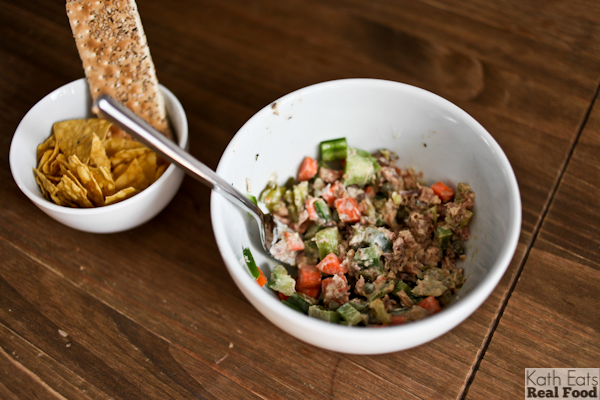 A late lunch – sardines! I made a salad with greek yogurt, mustard, capers, jalapenos, pickles, carrots and green peppers all chopped together. Served with crackers and chips.