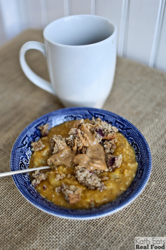 Sunday was full of chores, an indoor soccer game (we lost this time 🙁 ) and relaxing. Breakfast was pumpkin oats with crumbled oat berry muffin on top and peanut butter drizzle.