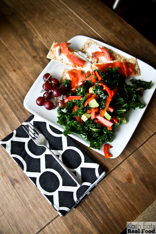 Lunch was epic – smoked salmon and cream cheese on crackers plus leftover kale salad and grapes. I am craving cream cheese like a pregnant lady these days! (However, to clarify, I am not one.)