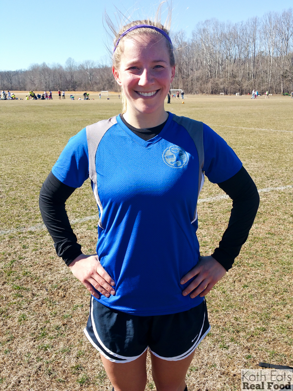I ate a delicious PB&J for lunch and then it was off to soccer! I’m playing on the women’s league as well as the co-ed and all of our games thus far had been canceled due to muddy fields. This week our co-ed game was cancelled and the women’s was on! It was a glorious day for soccer, muddy puddles and all. And we won!