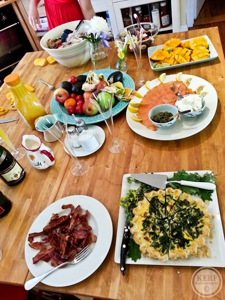 After that I headed to the gym for a quick workout while the boys napped and then quickly showered so we could all enjoy this wonderful spread! Quiche by Matt plus smoked salmon, bacon, mangos, fruit and bagels. And mimosas!