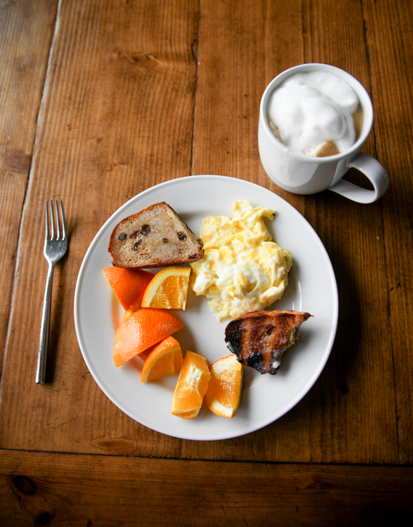Saturday AM breakfast – filling enough to get us to Richmond! Irish Soda Bread + Cinnamon Chip mini pieces, eggs, orange, cappuccino.