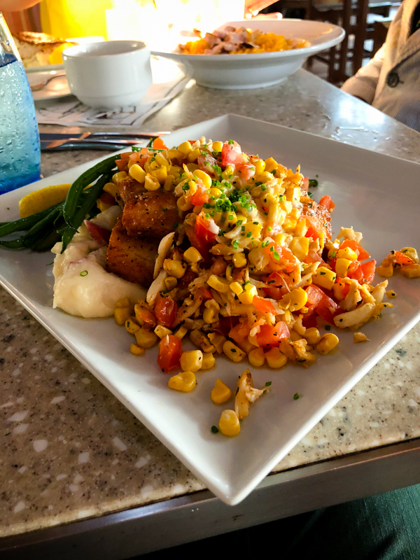 I had a crab-topped local rockfish for dinner, which was amazing!! Plus a cornbread muffin from the bread basket.