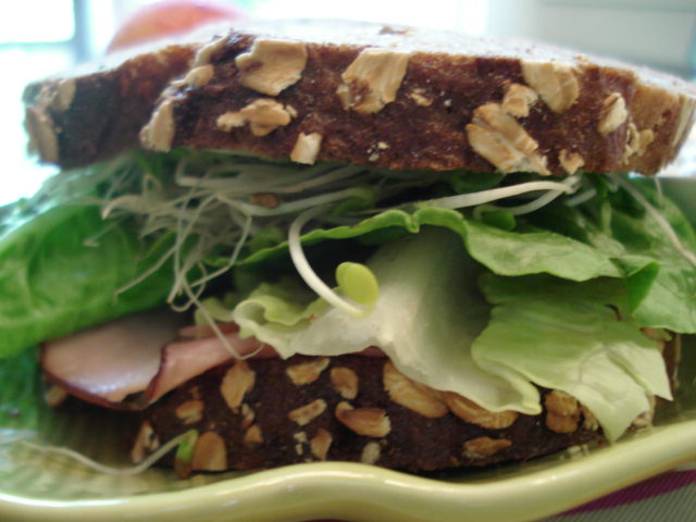 We not only have an abundance of lettuce, but also a package of deli meat the husband brought home from work yesterday. So sandwiches were required at this meal. I made one with very old stale 9 grain bakery bread (didn’t realize how old it was until my first bite!) plus 1 slice of salami , 1 slice ham, romaine, sprouts , cilantro pesto , and jalapeños .