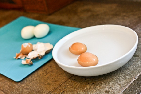First: hard boil your eggs. Put eggs in a pot of cold water and bring to just below a rolling boil. Cover and set timer for 13 minutes. Then dunk into ice water. New step I learned today: LET THEM COOL FOR A LONG TIME!