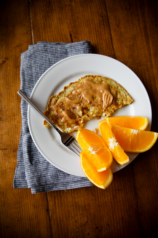 I just love how quick this is to whip up and how easy it is to make one big thin pancake and cut it up as opposed to 5 smaller ones that cook at different rates. Mazen and I usually share one with some fruit and peanut butter, although we can each eat a whole one no problem too!