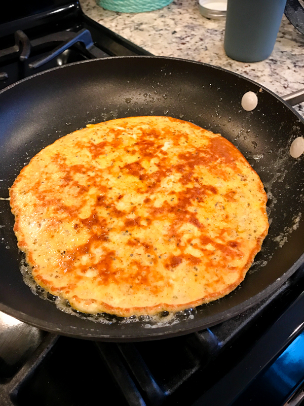 The recipe involves just three main ingredients plus added flavors – two eggs, a mashed banana, chia seeds, cinnamon and vanilla. It’s kind of a cross between a pancake and a crepe, I’d say. Pour the batter in a buttered omelet pan over low heat and it’s ready in 5 minutes.