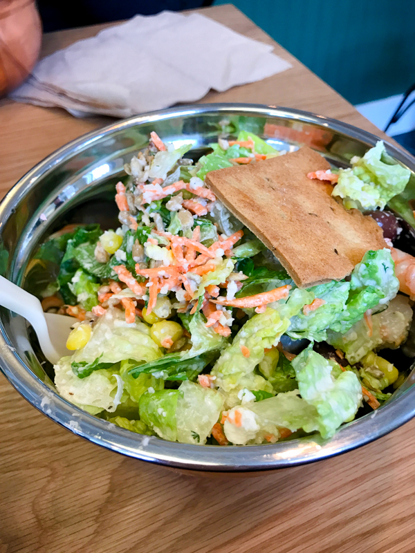I recently had lunch at The Salad Maker, our new downtown salad-heavy spot. I customized my own with romaine, olives, goat cheese, sunflower seeds, corn, carrots, and a creamy almond dressing. ‘Twas very good and hit the spot! Loved the little rye cracker on top.