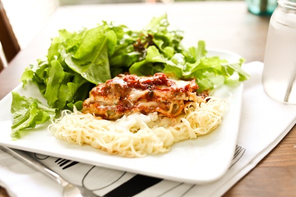 Back home, when I opened the fridge to get out some eggs to hard-boil, I realized we had a portion of leftover lasagna that needed demolishing. Along with some angel hair pasta. So I whipped …dinner for lunch!