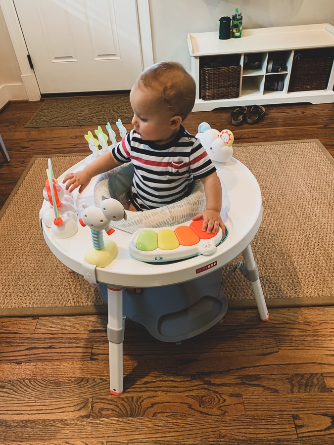 Now that we’re done with the doorway bouncer, which had to be taken away for safety reasons rather than dislike, we’ve moved on to bigger boy tables. Erica had this Skip Hop table in her basement – Fern was not a fan (yet!) so we’re borrowing it for now. Birch likes it for 15-20 minutes, so it’s been great to pull out around dinnertime.