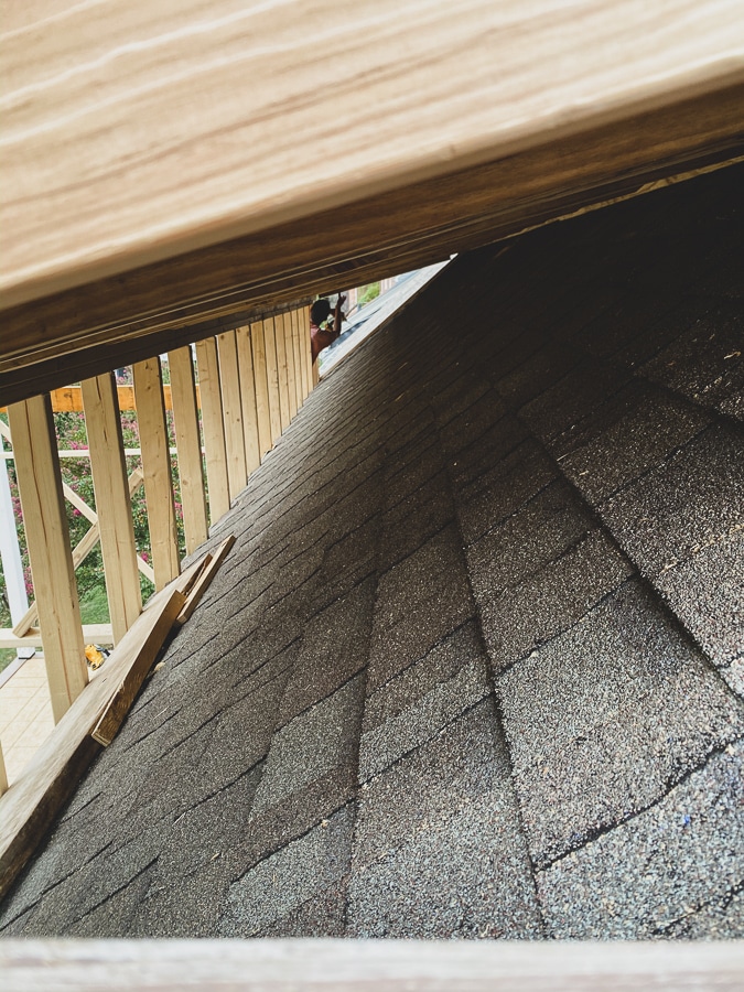 …we’re re-doing the back deck. This is the state of our roof deck. No one has even been up there to touch the railings and they’re falling off! So unsafe. They’re only a few years old too. Thomas’s company does things the right way, so we’re re-doing the deck – with some bells and whistles (!!)