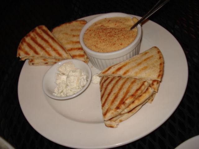 I was hungry, and while dinner held me over well, it was still smallish, so we decided to get an appetizer. Nothing hits the spot like pita bread…and hummus