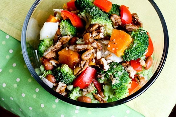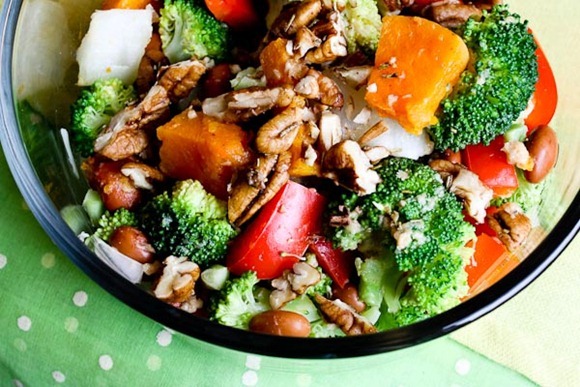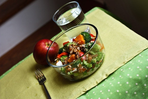 A nice hot mix of microwaved veggies – bok choy on the bottom, then pinto beans, broccoli, red pepper, leftover roasted butternut squash, and pecans.
