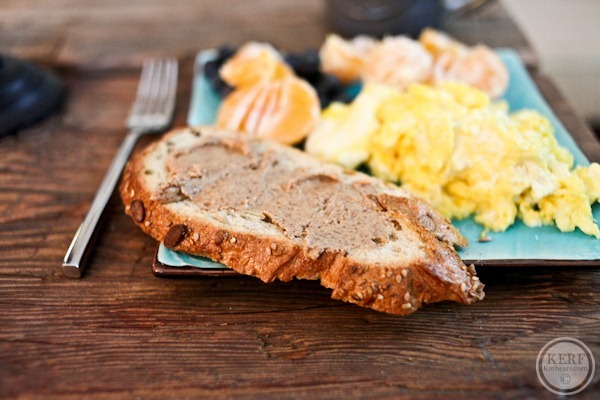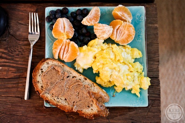 My breastfeeding cravings include: eggs. LOTS of eggs! Thus, I had eggs on the brain and our seedy sourdough just wouldn’t make good French toast. So I scrambled ‘em! 2.5 eggs for each of us.