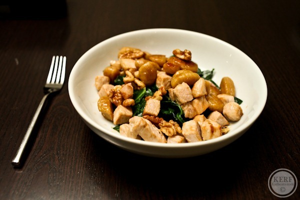 The gnocchi were from our Whole Foods, which has a fresh pasta bar. They have everything from pumpkin ravioli to whole wheat pasta, and I’ve been meaning to try it for ages. These sweet potato gnocchi were awesome! We boiled them and then sautéed alongside two pork chops from our freezer cut into cubes, a handful of walnuts and served all that over steam-sautéed collard greens. Everything had a mild butter-smoked maple flavor infused throughout.