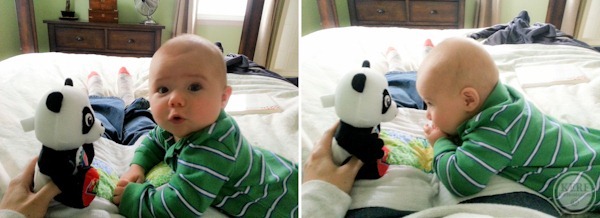 Playtime happened later. He made friends with a panda and practiced rolling over.