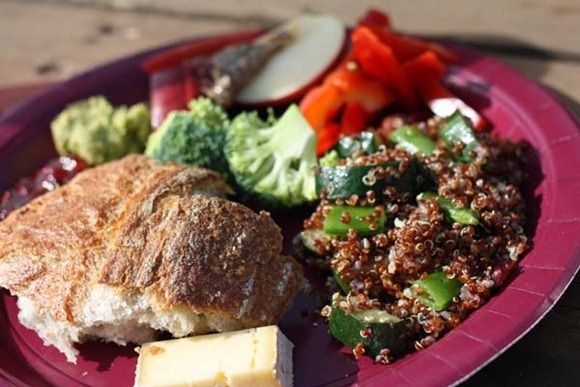 1 cup of red quinoa cooked and mixed with about 2 cups of sugar snaps from our garden, 2 medium zucchini (sauteed), about 3 tbsp of chopped hazelnuts and cranberries. The dressing was about 1/4 a cup of Garlic Gold Lemon Vinaigrette.