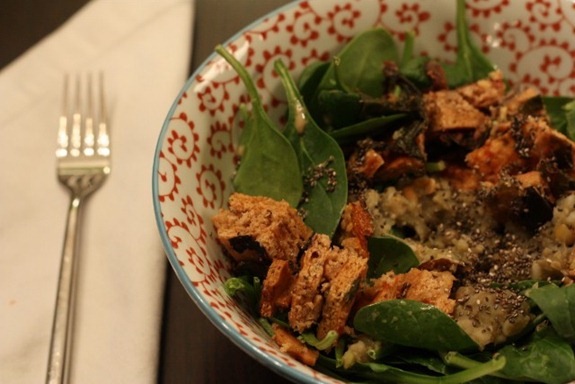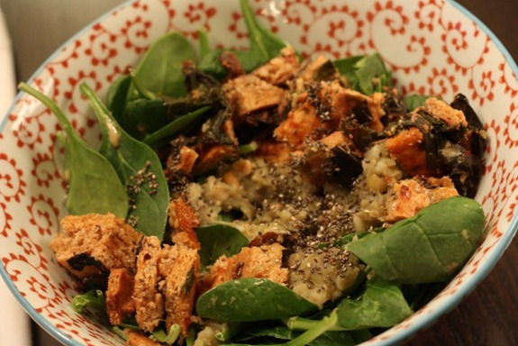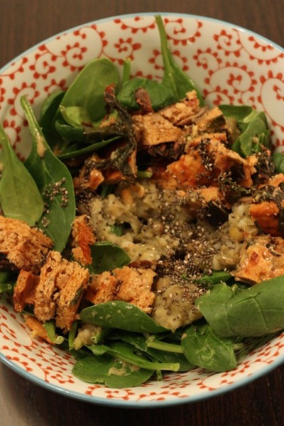 Spinach with some Annie’s Goddess dressing with heated Bob’s Red Mill soup and Dr. Kracker lasagna with chia seeds on top!