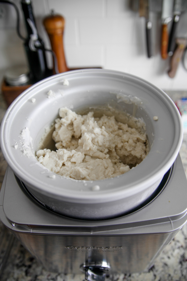 Once the tea is chilled (and also be sure your ice cream maker bucket has been in the freezer for 24 hours!), add the vanilla, coconut milk (the whole can), and two pinches of salt along with the tea, then churn for 30 minutes or so till it looks like so. It will be chunky frozen but not totally scoop-able yet.